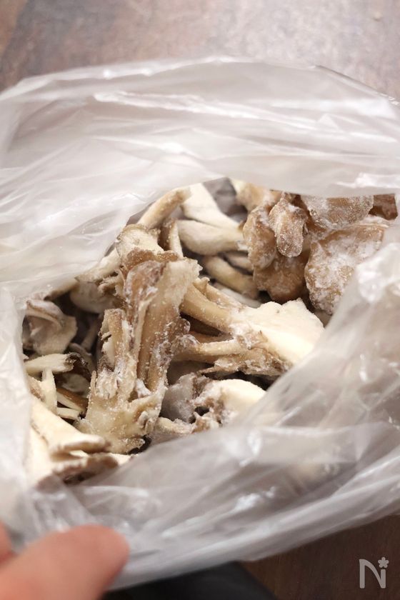 (1) 舞茸を手で食べやすい大きさに割き、片栗粉と一緒に袋(アイラップなど)に入れ、袋の口を閉じてよく振る。