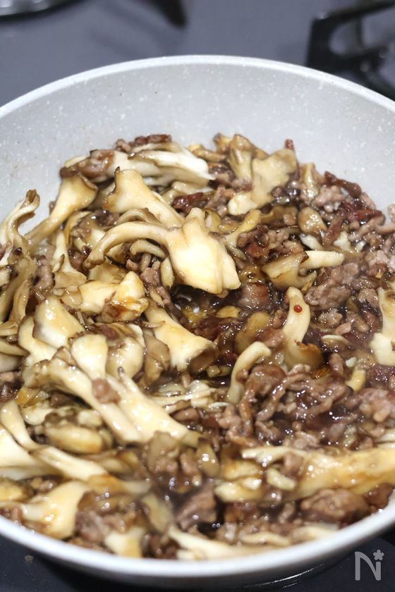 (2) フライパンにごま油をひいて中火にかけ、合い挽きを入れて炒める。合い挽き肉に火が通れば、工程1の舞茸を入れ、舞茸がしんなりするまで炒める。
