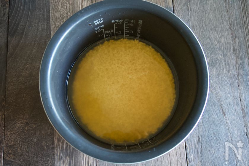 (1) 米を研いでおく。炊飯釜に洗った米、【A】、だし汁を2合の線まで(この後炒める具材の汁も入れるので少しだけ少なめがおすすめです)入れておく。