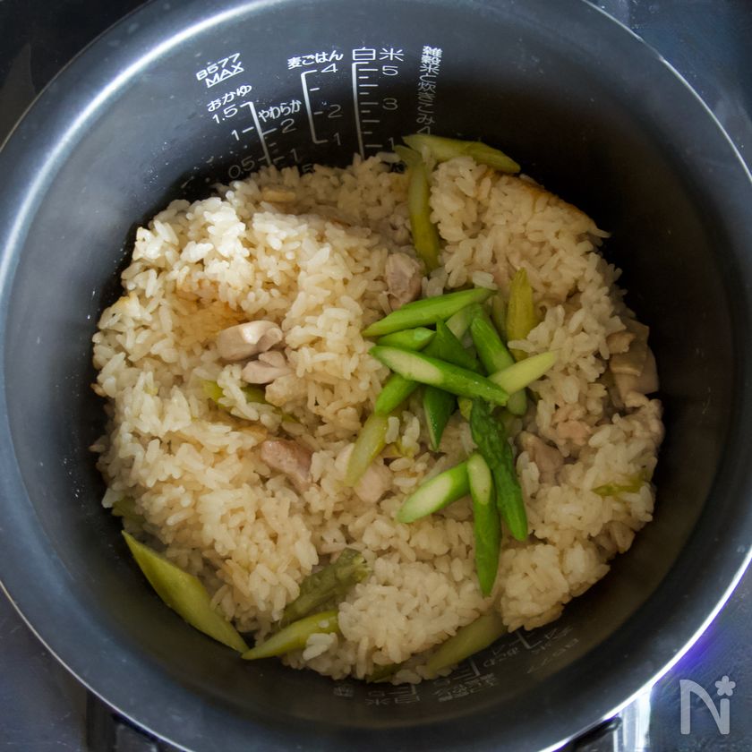 ・アスパラは細い場合、さっと炒めると余熱で火が通りますが、太くて火が通ってない場合は、炊きあがったご飯にアスパラ加えた後、1分ほど蒸らして火を通します。