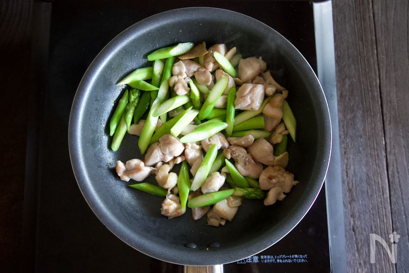 (3) フライパンを熱し、鶏肉を入れて塩を振って中火で焼く(あまり動かさない)。焼き色が付いたら裏返し両面焼く。アスパラを加えて軽く塩を振り、さっと炒めたら火を止める。