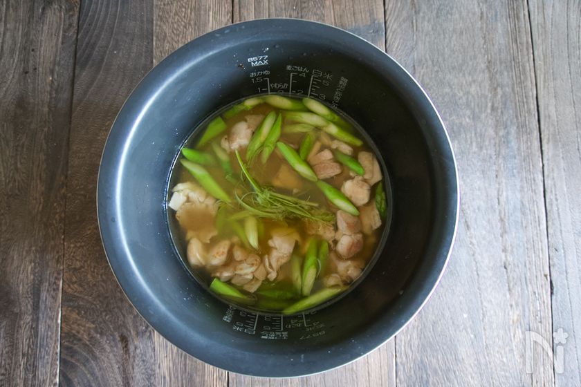 香りも味も楽しめる【アスパラと鶏肉の炊き込みご飯】