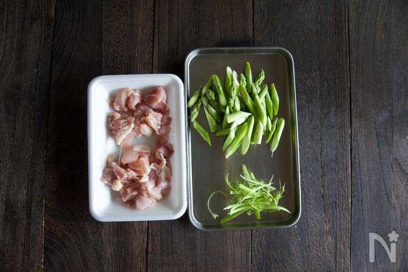 (2) アスパラは根元を1cmほど切り落とし、根元から4〜5cmの部分の皮をピーラーでむく。(むいた皮は捨てずに取っておく。)3cm長さの斜め切りにする。鶏もも肉は1.5cm角に切る。