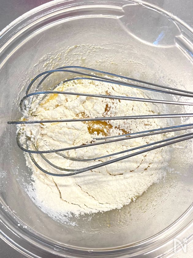 (2) 薄力粉をふるい入れて混ぜる。