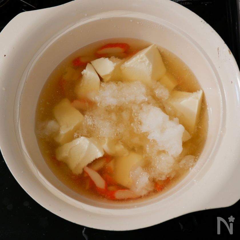 (2) 小鍋に絹豆腐、カニカマ、だしの素、水を入れる