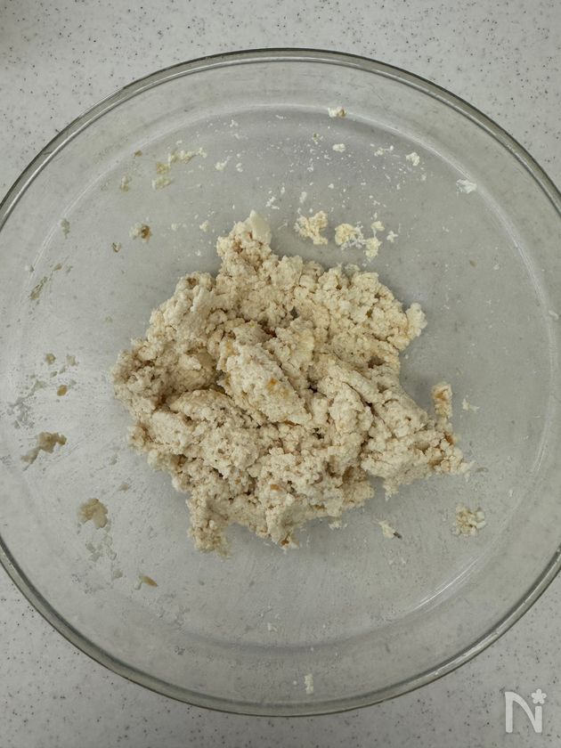 (2) ボウルに、水切りした豆腐を入れ、綿棒等で潰したら、【A】を入れ、滑らかになるまで混ぜる。