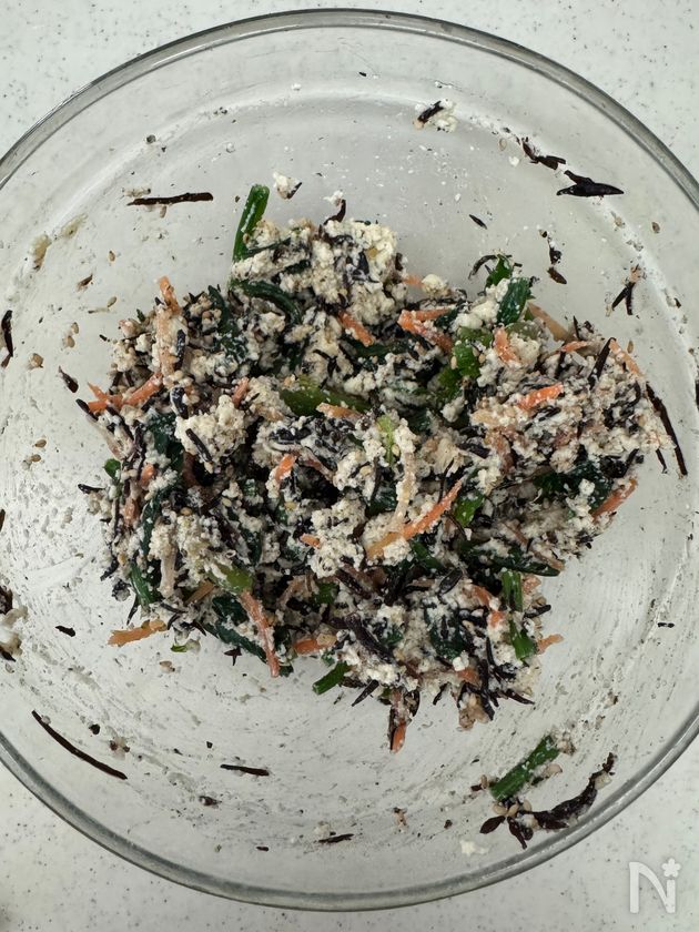 (3) 1にほうれん草、人参、ひじき、【B】を入れ、混ぜ合わせる。