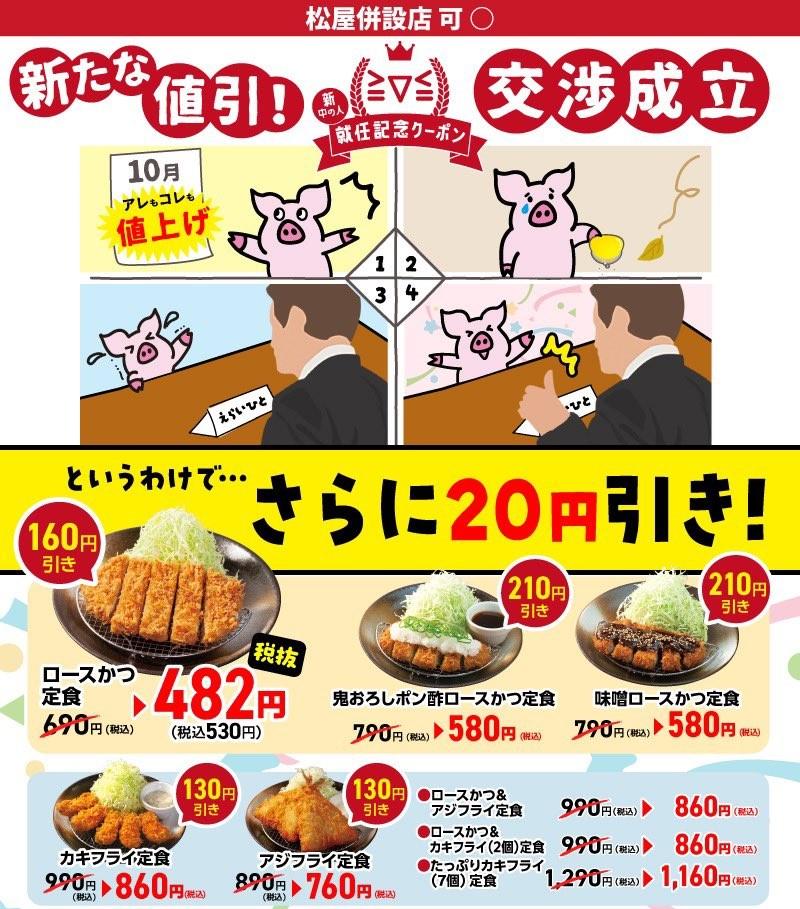 2025年10月16日現在、「松のや」の公式Xでは、すでに値引きされている定食メニューがさらに20円引きになるクーポンを公開しています。