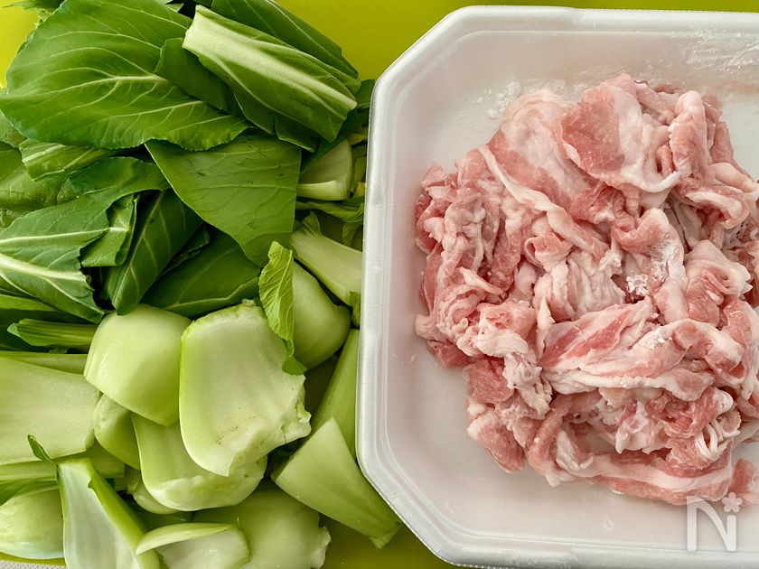 (下準備) 豚薄切り肉は塩こしょう少々(分量外)を振り、片栗粉をまぶす。