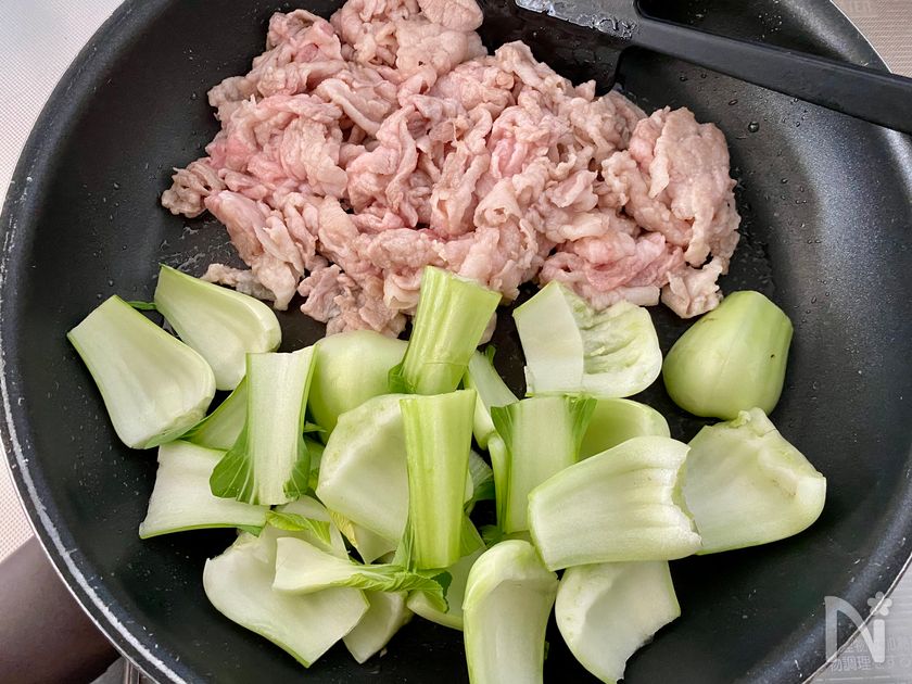 (2) チンゲン菜の茎をフライパンに加え、中火で3分程炒める。