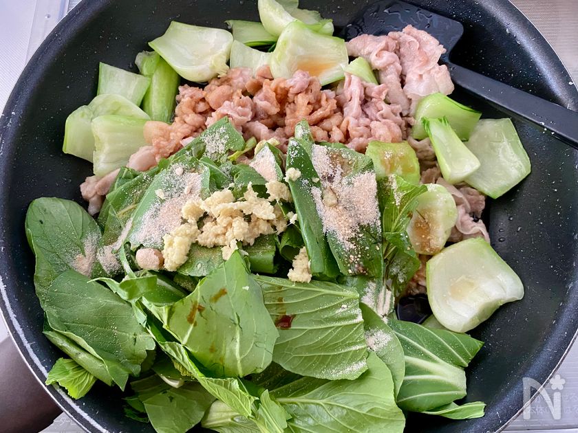(3) チンゲン菜の葉と【A】を加え、中火で2分程炒める。