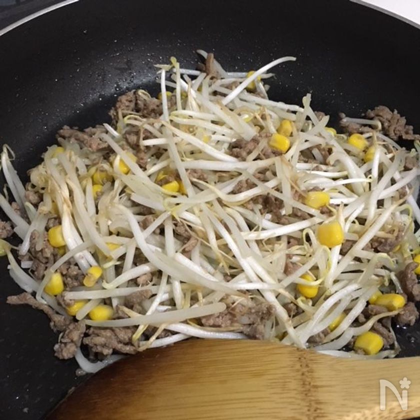 フライパンにごま油を熱し、合いびき肉を炒める。色が変わって来たら、もやし・コーンを加えて炒め、【A】で味付けする。