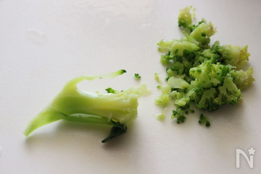 ブロッコリーは初期食・中期食では茹でた花先のみ使いましょう。茎は大人ごはんに。