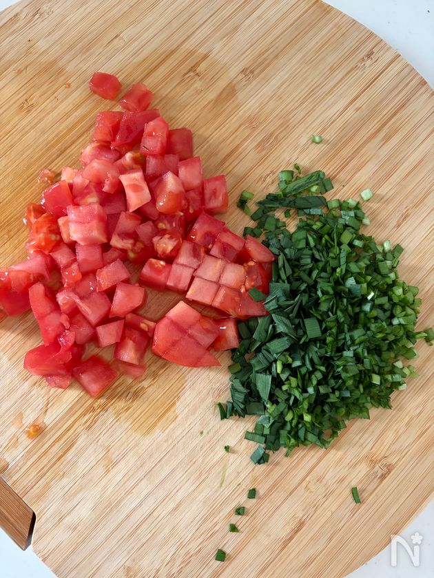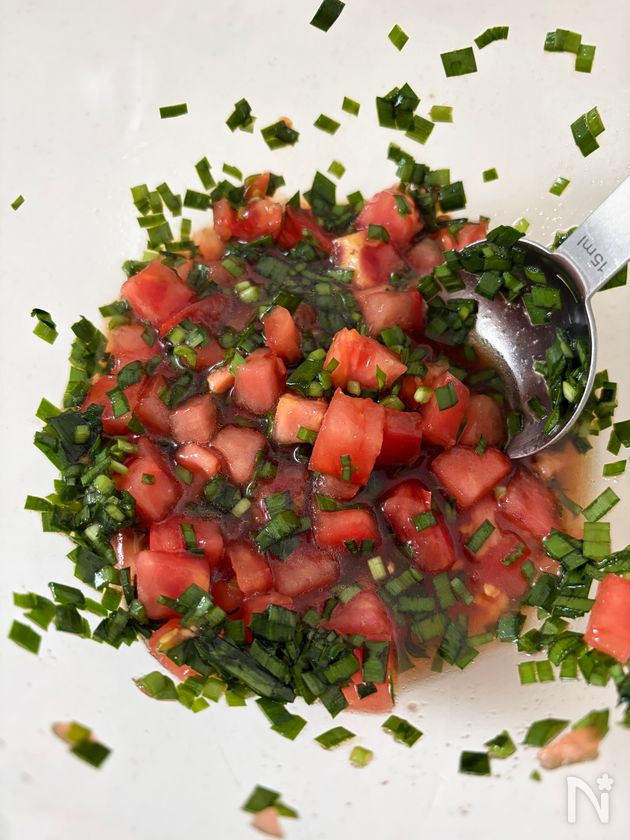 ■ トマトとニラは細かく切ることで、タレとよくなじみ全体に味が行き渡る