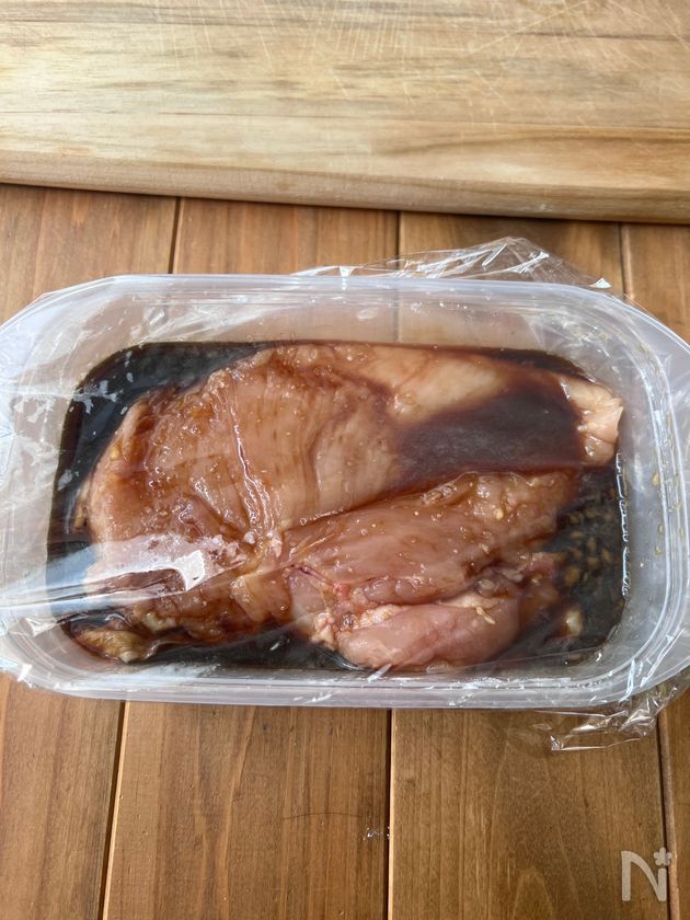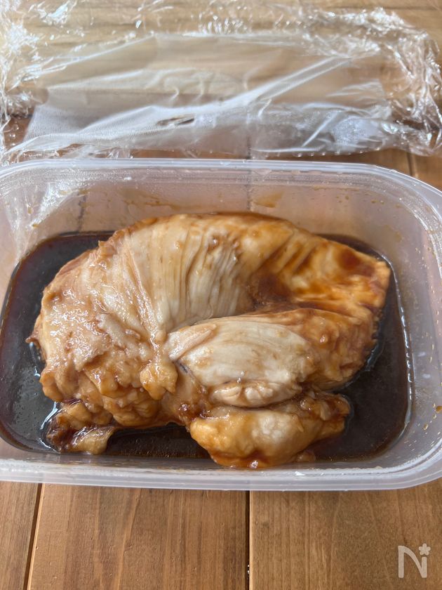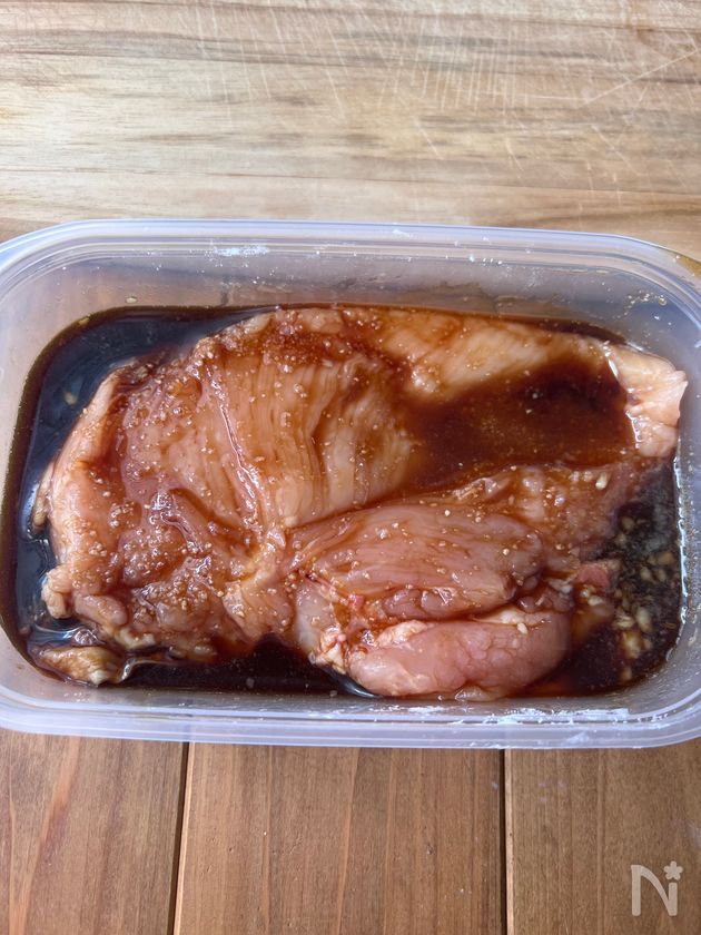 (1) 耐熱容器に皮目を下にむね肉をいれ、【A】を刷り込むように馴染ませる。