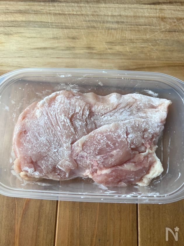 (下準備) ・鶏むね肉の両面をフォークで20〜30ヶ所刺し、片栗粉を全体に馴染ませる。