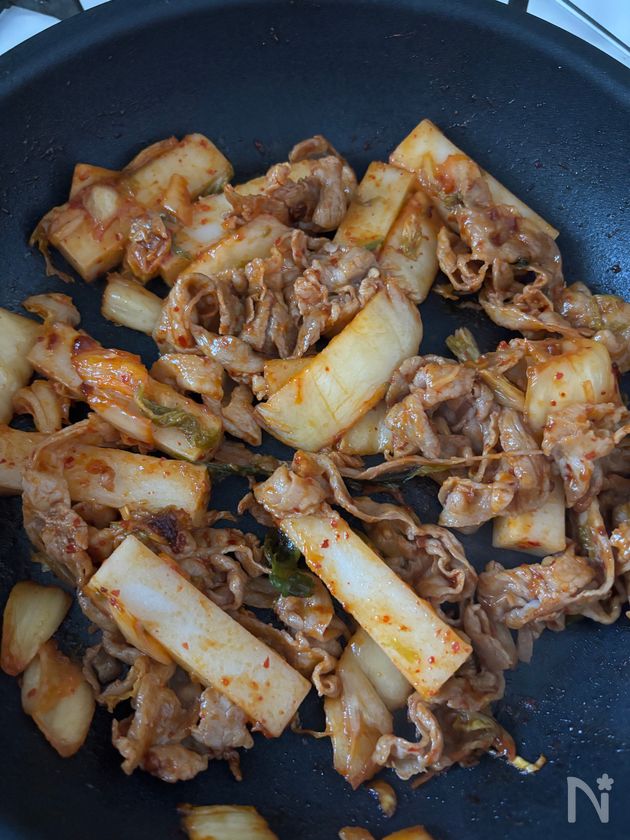 さらにキムチを加え、全体をさっと炒め合わせる。