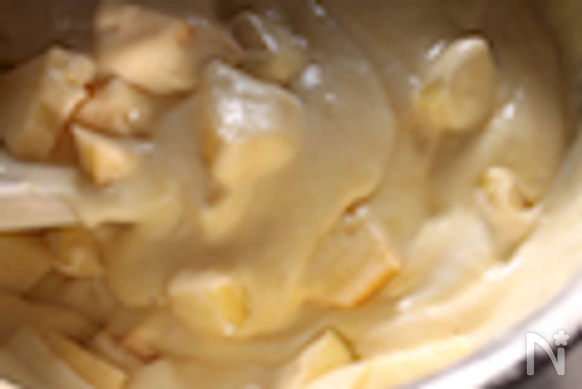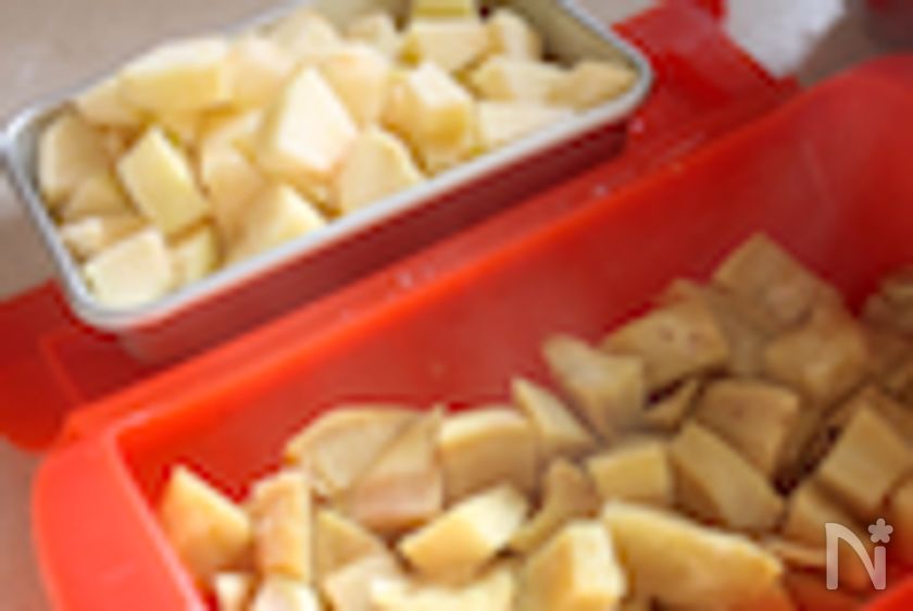 (6) 串切りにしてさらにスライスしたりんご、さつまいもを入れて混ぜ合わせる。