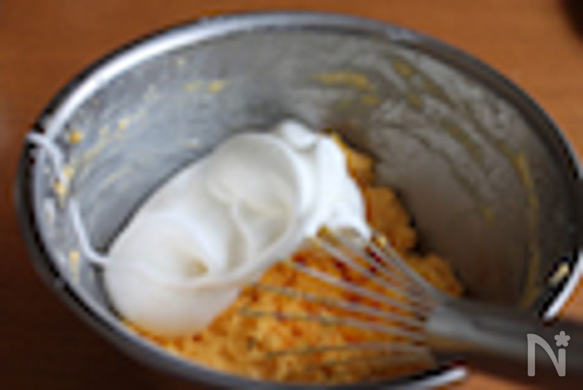 (5) 3に4のメレンゲを3回に分けて入れそのつどゴムベラでしっかり混ぜる。