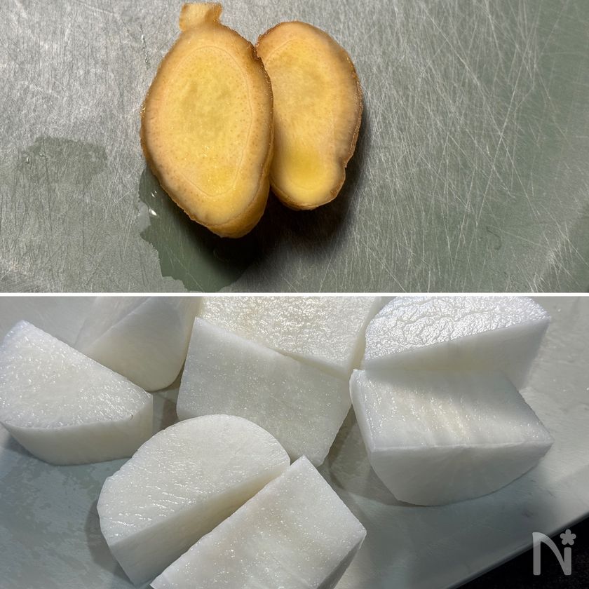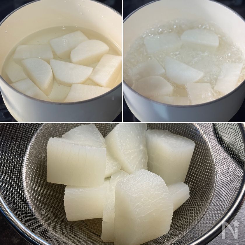 (1) 鍋に大根を入れ、かぶるくらいの水を加えて中火にかけ、沸騰したら火を弱めて15分ほど竹串がすっと通るまで煮る。煮えたらざるに上げて水気を切る。