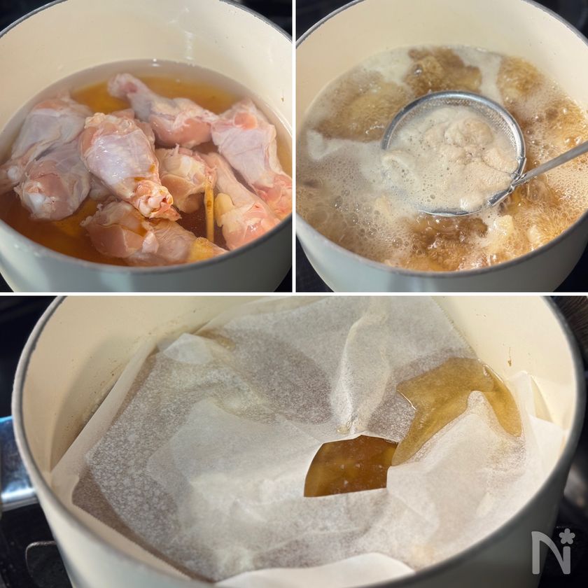 (2) 同じ鍋をさっと洗い、水600mlと【A】、手羽元、生姜を加えて中火にかける。煮立ったらアクを取り除き落とし蓋をして弱火で約20分煮る。