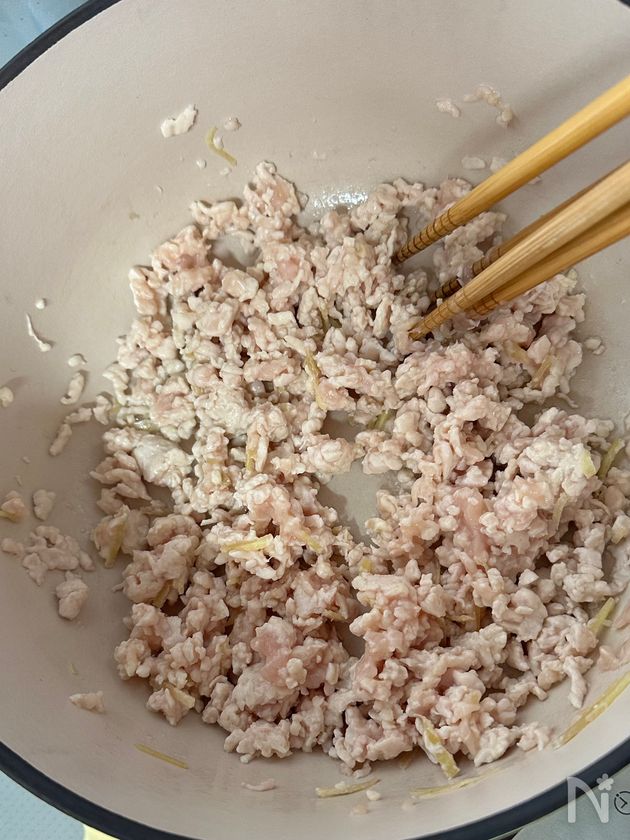•鶏ひき肉は菜箸を複数本使い、ほぐしながら炒めるとほろほろになります。