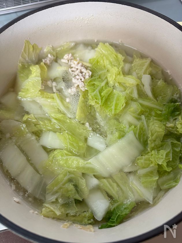 (3) 白菜、水を加え、ふたをして中火で熱し、煮立ったらあくを取りながら白菜がやわらかくなるまで7〜8分煮る。