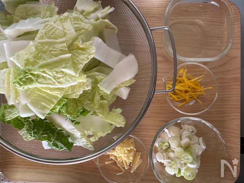 (1) 白菜は3cm幅のざく切り、長ねぎは小口切り、しょうが、ゆず皮は千切りにする。ゆずの果汁をしぼる。