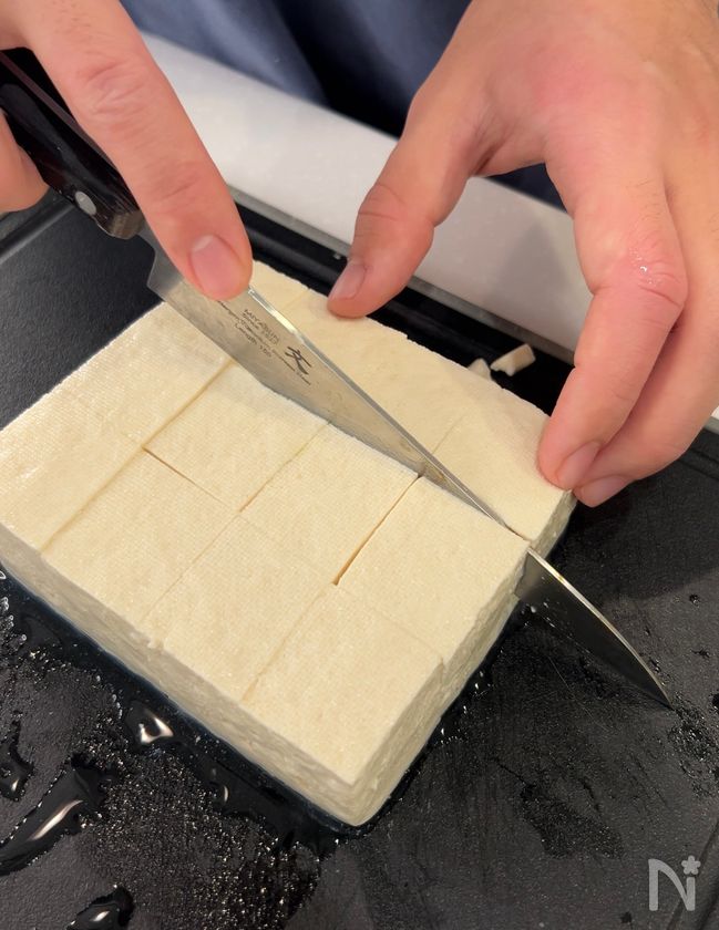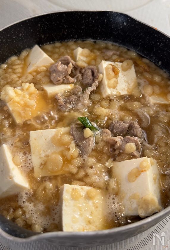 (3) ひと煮立ちしたら、豆腐と天かすを入れて、5分煮込む。