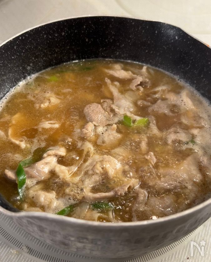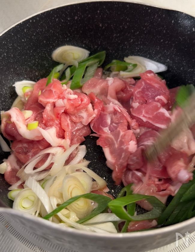 (1) 鍋にごま油をひき、豚肉と長ネギを入れて、中火にかける。