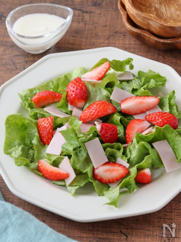 (4) 葉物、ハム、いちごを盛り付けソースを食べる直前にまわしかけ、好みで粗挽き黒こしょうをふる。