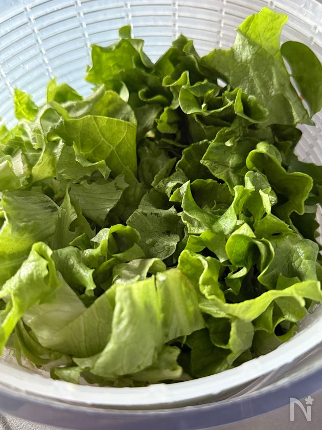 (1) リーフレタスは洗って横3〜4cm幅1〜2cmに切る。