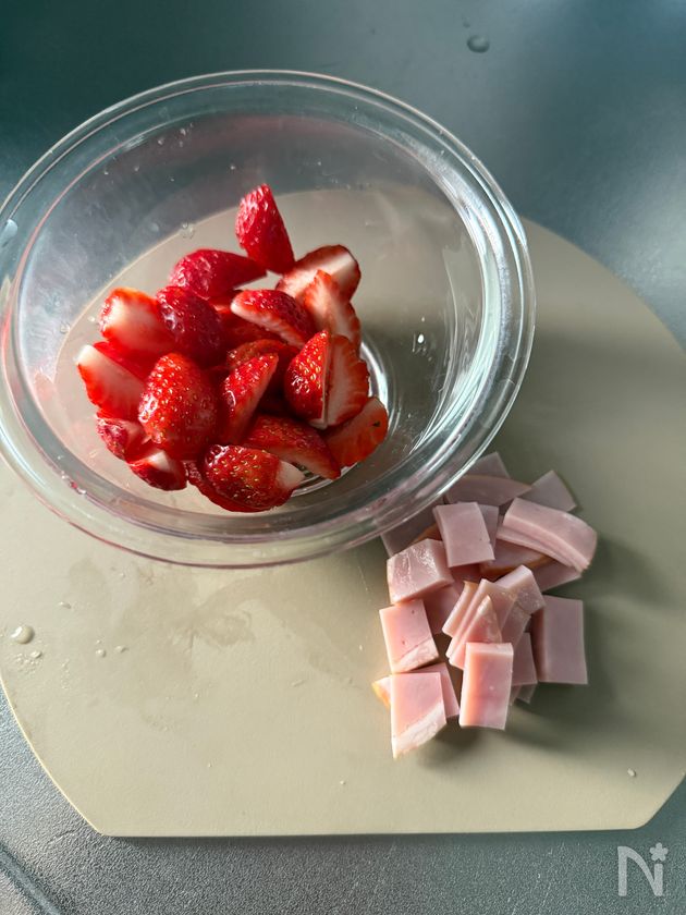 いちごは洗って水気をふき、ヘタを取って4等分のくし形切りにする。