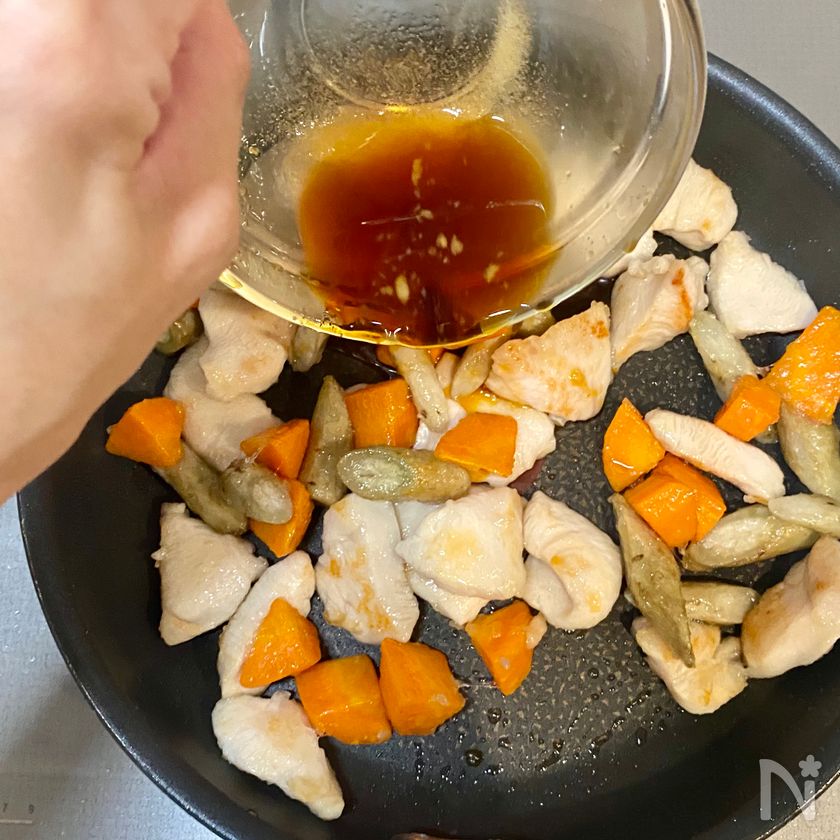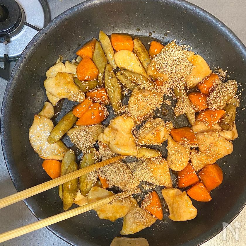 マジ旨!柔らか鶏むね肉deゴボウと人参のごまだく照り炒め
