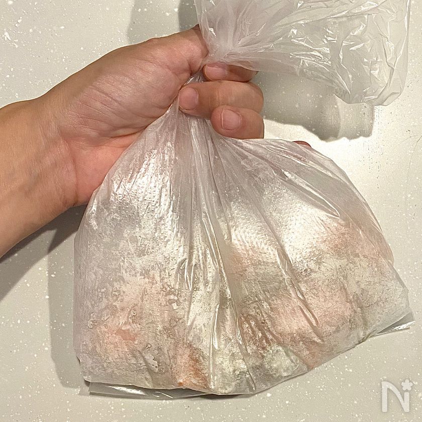 (3) ザルに上げてしっかりと湯切りし、【B】と一緒にポリ袋に入れて上下に振りしっかりとまぶす。
