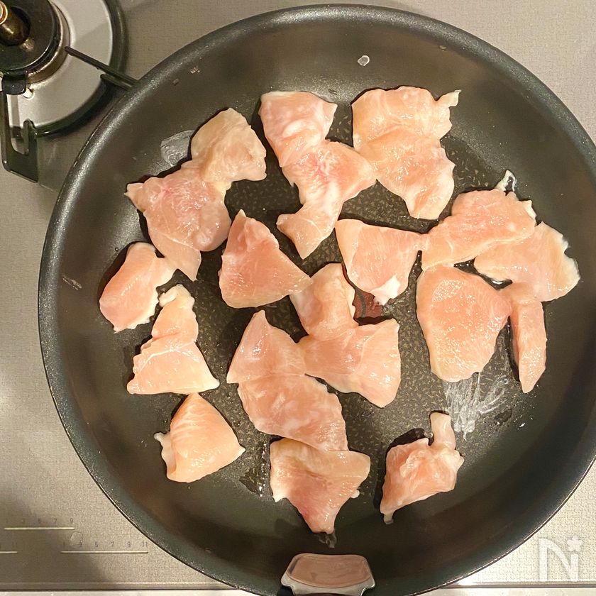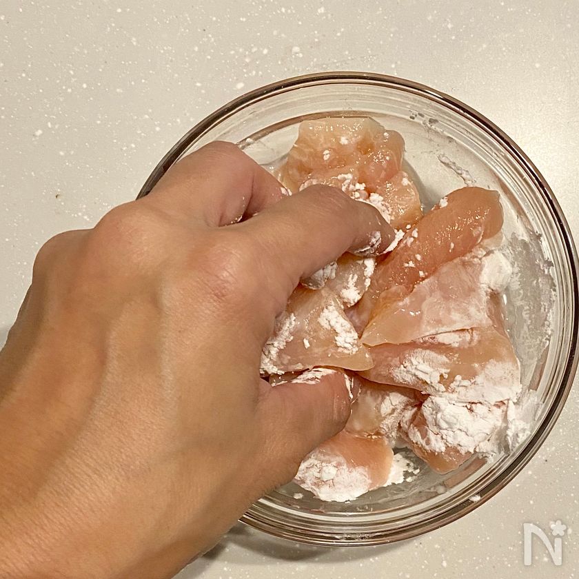 (1) 鶏むね肉は1cm幅の削ぎ切りにして【A】を揉み込む。