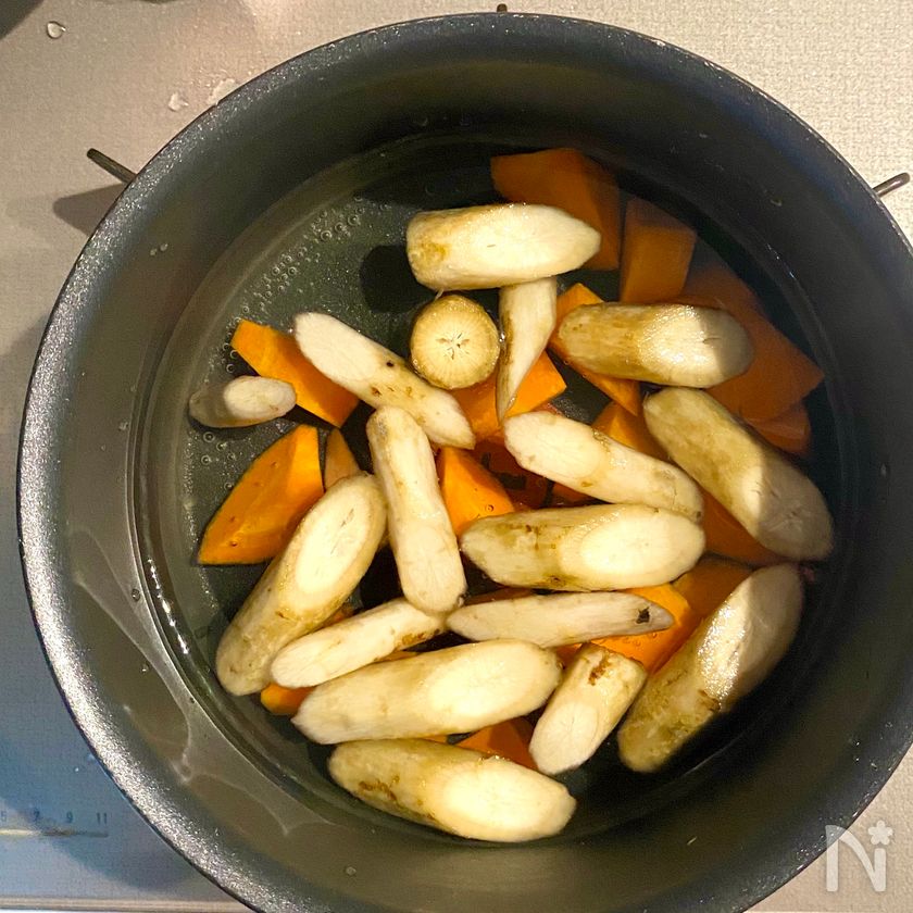 (2) ごぼうは3cm幅の斜め切りにして、人参は乱切りにし、熱湯で3分ほどで下茹でする。