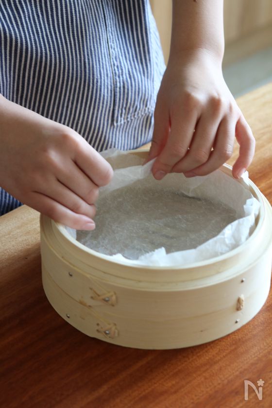 (下準備) ・せいろ全体を水で濡らし、クッキングシートを敷いておく。