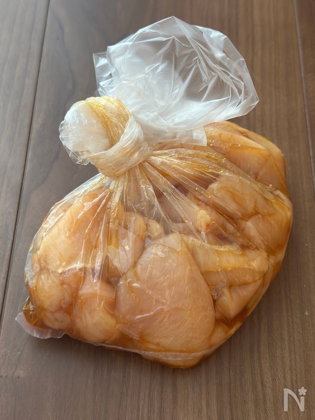 ポリ袋に鶏むね肉と【A】を入れてもみ込み、10分おいておく。
