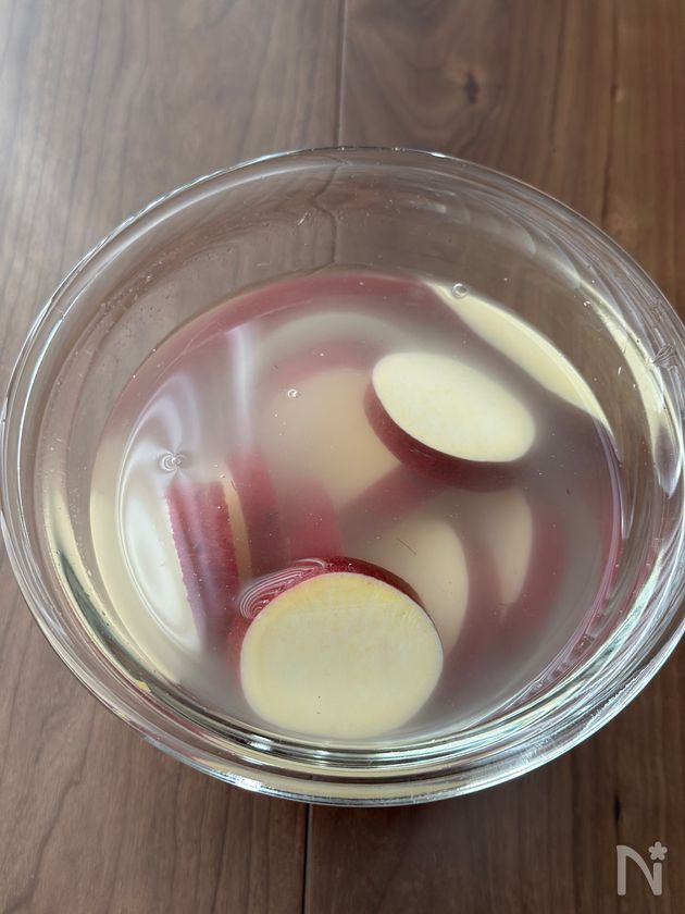 (1) さつまいもは1cm厚さの輪切りに切り、水(分量外)に5〜10分浸してアク抜きする。