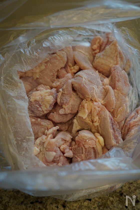 (1) ポリ袋に鶏もも肉、こめの香(グルテンフリー)をいれて全体にまぶす。