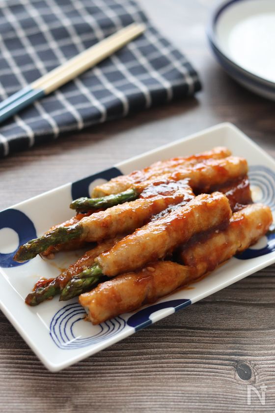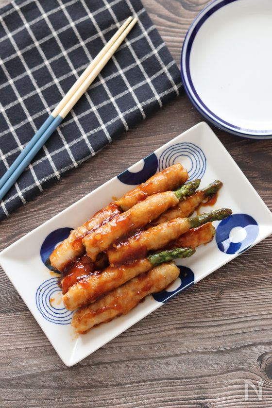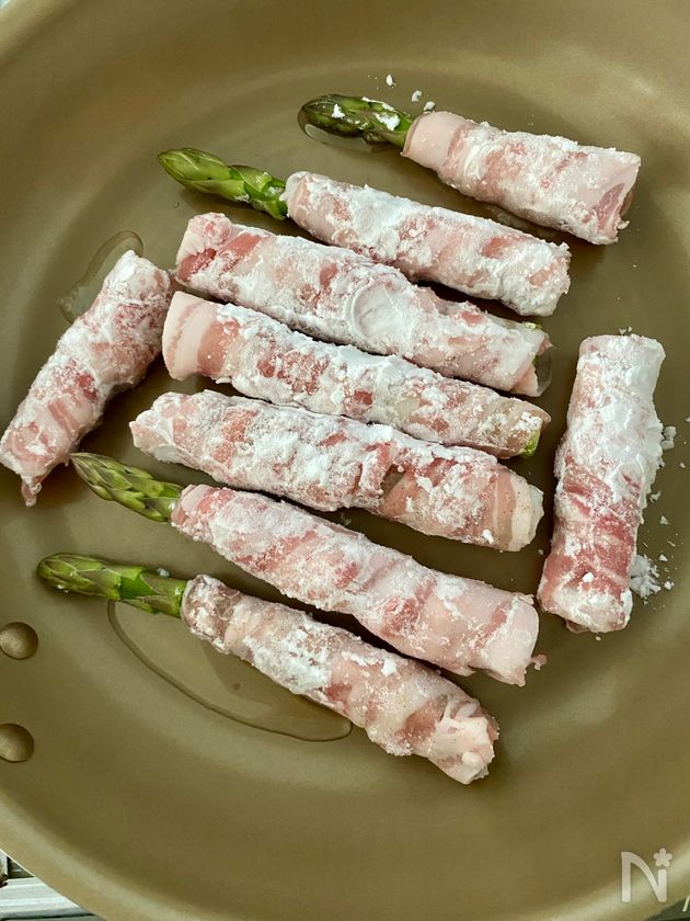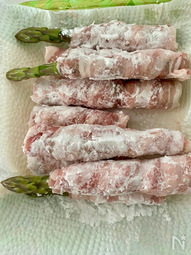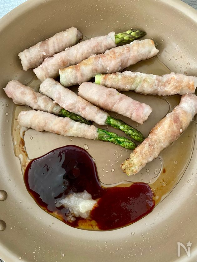 (下準備) アスパラガスはハカマを取り、根本の固い部分を1~2㎝ほど切り落としたら、切り落としたところから3~5㎝ほど、薄くピーラーで皮をむく。豚ばら薄切り肉を均等に巻き付け、塩こしょう少々(分量外)をふり、お好みで2~3等分に切る。お肉の部分に片栗粉をまぶす。