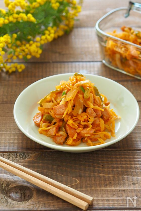 空いている部分に【A】を入れて調味料を混ぜ、中火で2分ほど、タレを絡ませながら火にかける。
