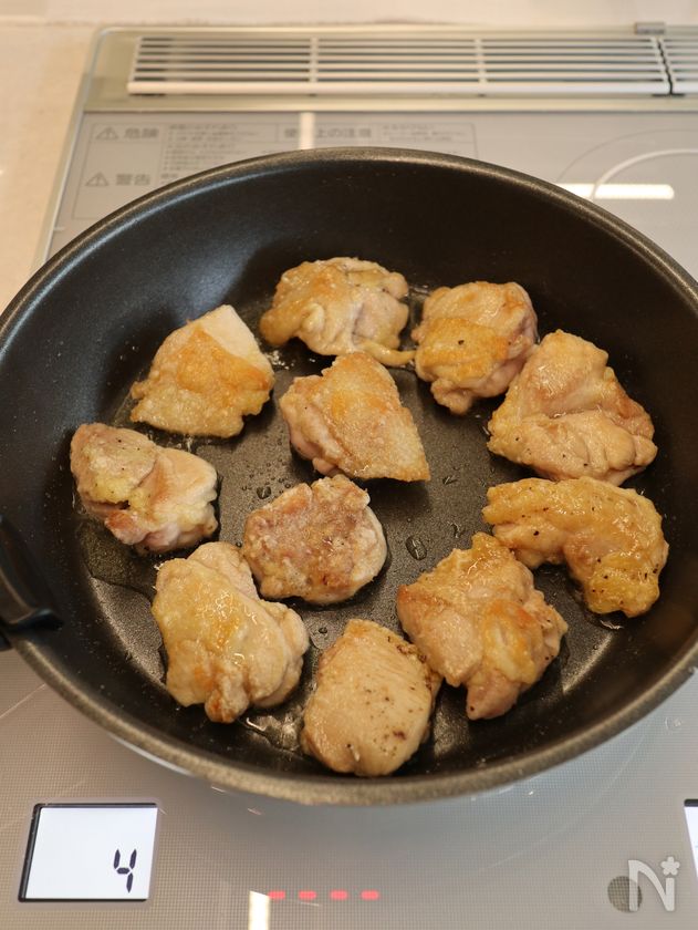 (4) 鶏肉に片栗粉をまぶす。フライパンを中火(IHヒーター火力ランプ[4])で加熱し、サラダ油を入れ、鶏肉を4分焼く。