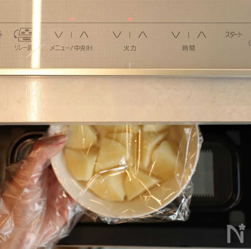 (3) 耐熱容器に新じゃがいもを入れ、少量の水(分量外)をかける。