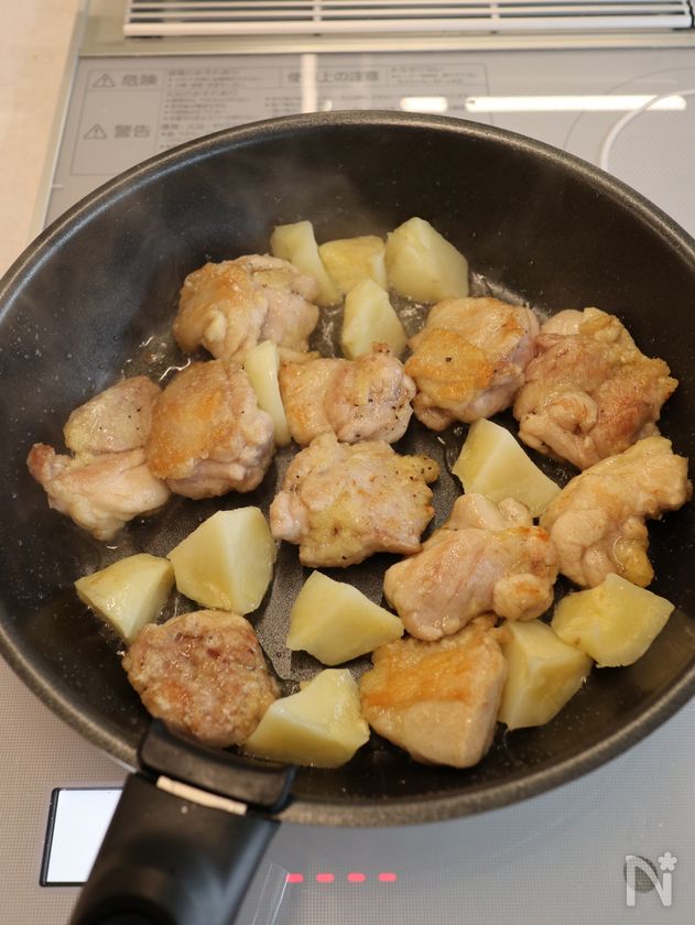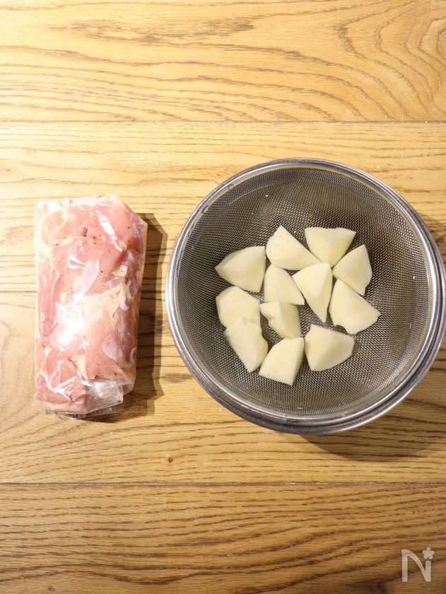 (1) 鶏もも肉、皮をむいた新じゃがいもはひと口大に切る。