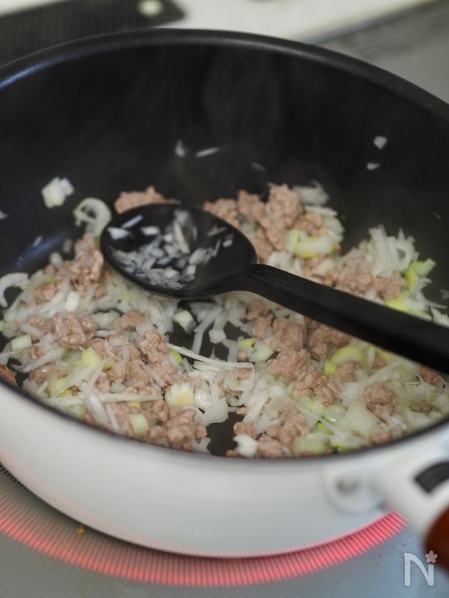 (2) フライパンにごま油をひいて中火で熱し、豚ひき肉を炒める。5割ほど火が通ったら長ネギを加えて2分ほど炒める。