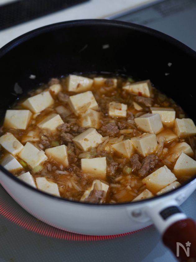 (3) 【A】を加えてさっと混ぜ、豆腐を入れて2分煮る。