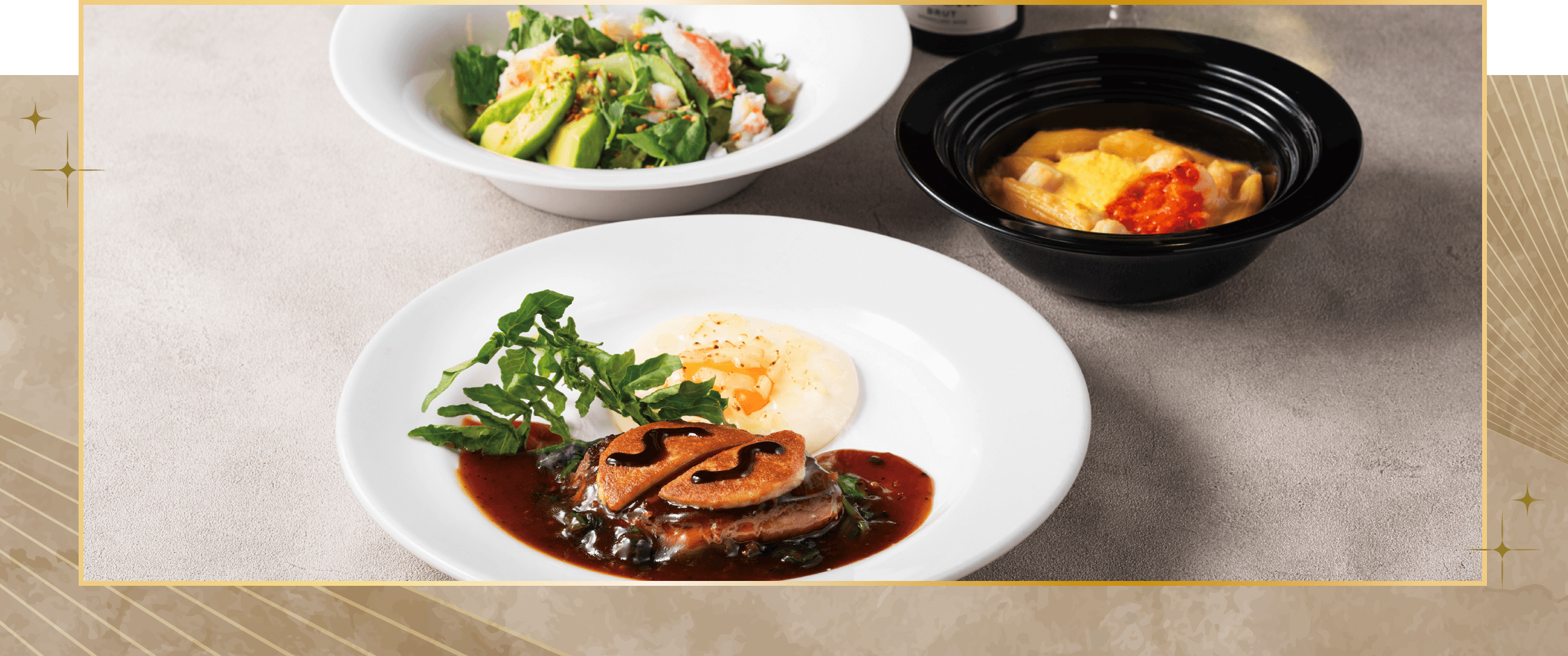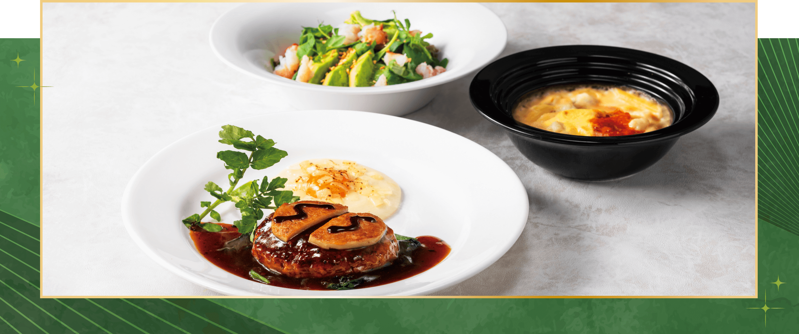 - 19世紀の美食家ロッシーニが愛したとされる「牛フィレ肉×フォアグラ×トリュフ」の黄金の組み合わせ。デニーズでは、この贅沢な味わいを現代風にアレンジして再現しました!