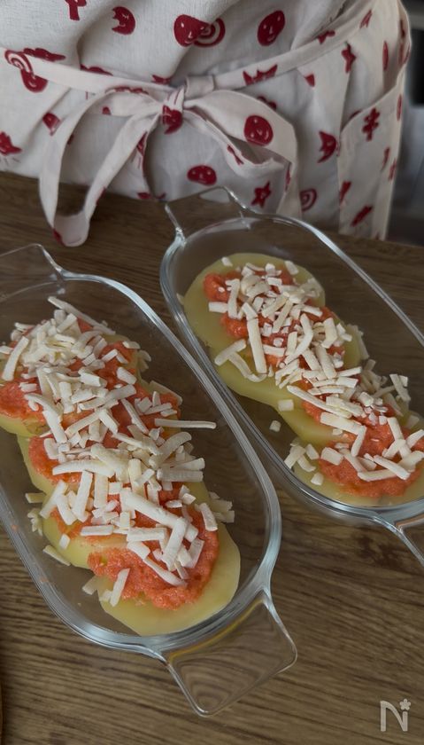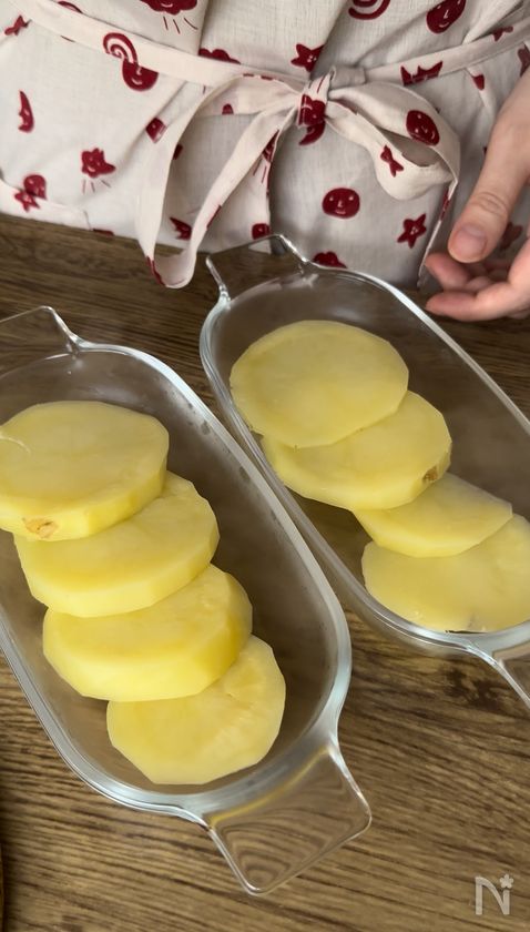 (1) じゃがいもは水気を切り耐熱容器に入れてラップをし、レンジ600W4分加熱する。水気を切り耐熱皿に並べる。